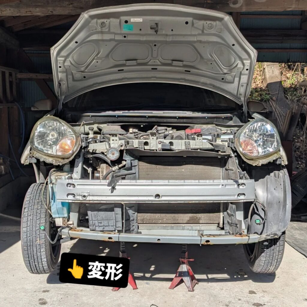 バンパーサポートメンバーが突き上げられて変形。