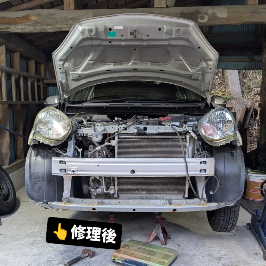 理想の修理ではありませんが、予算は無限ではありません。中古部品を積極的に使い、工夫して機能と見た目に問題ない程度にパッと直して、浮いた予算と時間でヘッドライト磨きやコーティングなど、他に出来る事を沢山してあげたいと僕は思います。