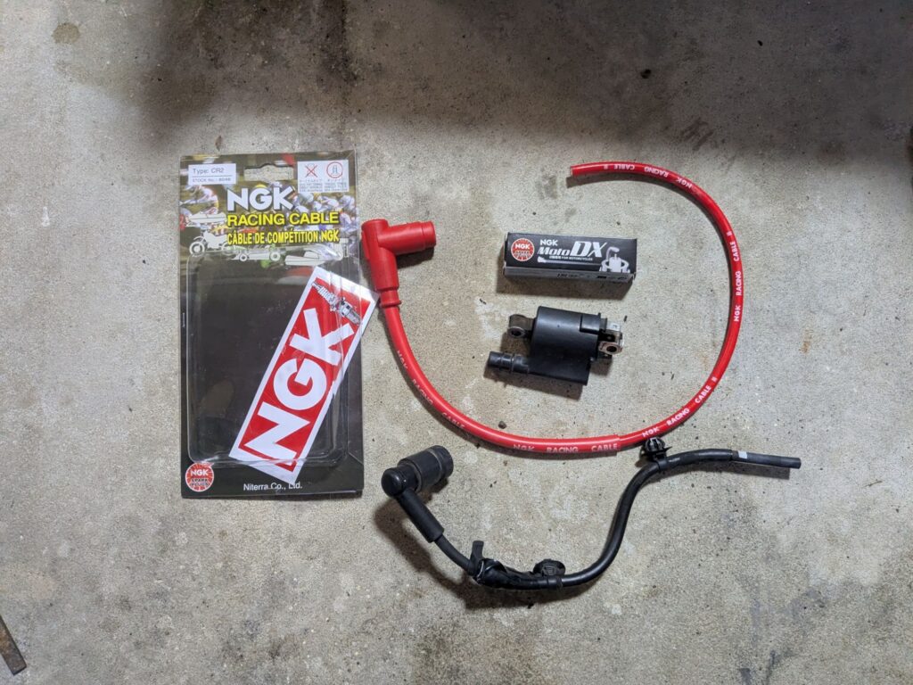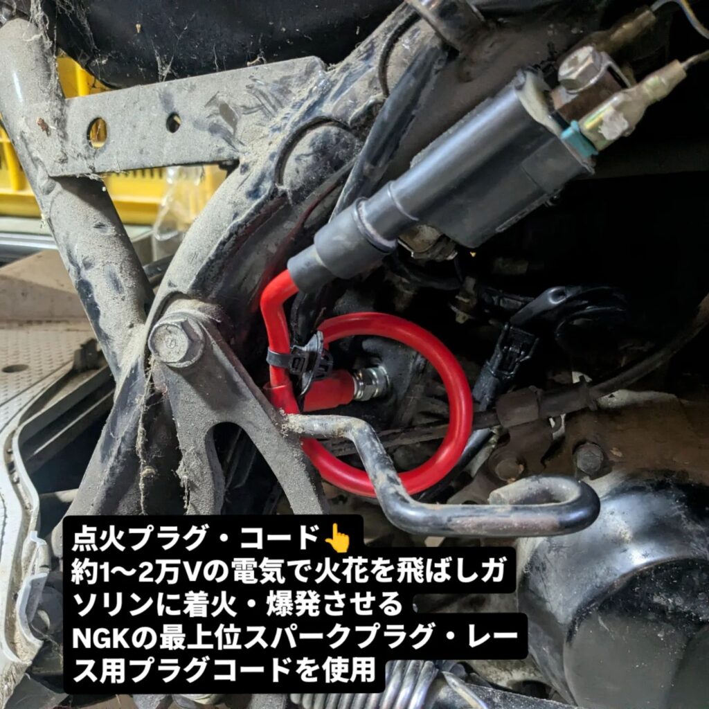 プラグコードから電気がリークしていました。走行距離も凄まじいので、MotoDXプラグに交換し、レーシングプラグコードに。