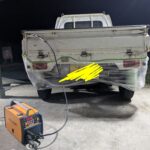 衝突安全性や走行性能には関与しない部分なので、切開して力を逃がして叩いて、裏板を当てて溶接修理しました。シーラーで塞いで完了。